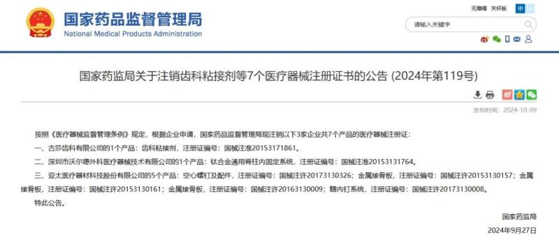 10月9日,國(guó)家藥監(jiān)局發(fā)布一則醫(yī)療器械注冊(cè)證注銷公告,公告顯示,該局已依法注銷古莎齒科有限公司、深圳市沃爾德外科醫(yī)療器械技術(shù)有限公司等3家企業(yè)共計(jì)7個(gè)產(chǎn)品的醫(yī)療器械注冊(cè)證,具體如下: