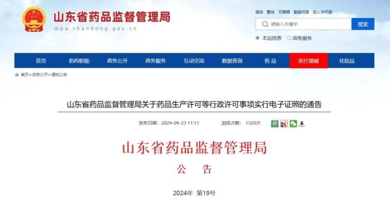 近日,山東省藥監(jiān)局發(fā)布《關(guān)于藥品生產(chǎn)許可等行政許可事項(xiàng)實(shí)行電子證照的通告》,其中提到,自2024年10月1日起,該局受理的藥品生產(chǎn)許可、藥品經(jīng)營許可(批發(fā))、醫(yī)療機(jī)構(gòu)配制制劑許可、醫(yī)療器械生產(chǎn)許可、化妝品生產(chǎn)許可、醫(yī)療單位使用放射性藥品許可、藥品醫(yī)療器械互聯(lián)網(wǎng)信息服務(wù)審批共7個事項(xiàng)(含核發(fā)、變更、延續(xù)、換發(fā)),實(shí)行電子證照。