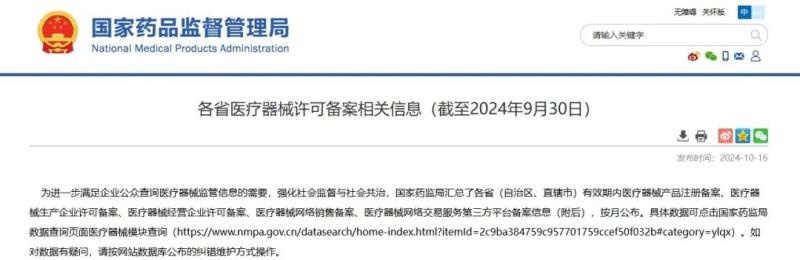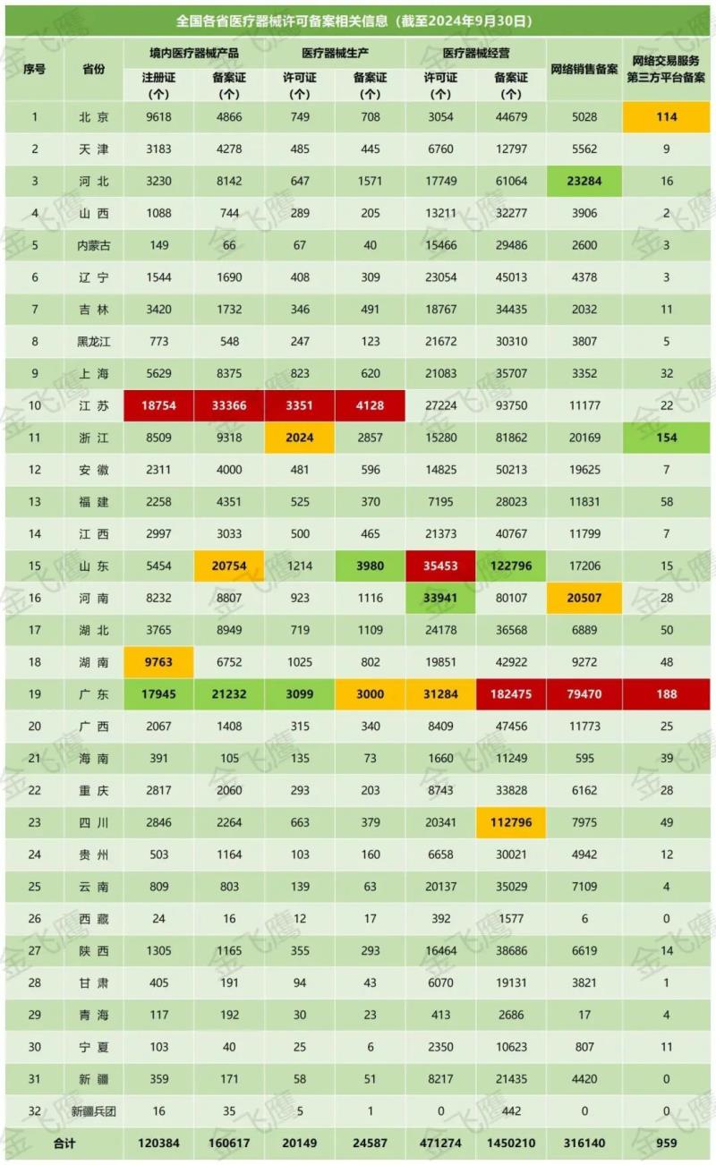 10月16日,國(guó)家藥監(jiān)局公布了截至2024年9月30日各省有效期內(nèi)醫(yī)療器械產(chǎn)品注冊(cè)備案、醫(yī)療器械生產(chǎn)企業(yè)許可備案等信息,老規(guī)矩,金飛鷹小編對(duì)此稍作編輯,標(biāo)注紅色、綠色、黃色的分別為前三甲。