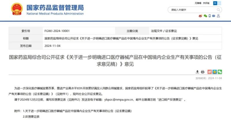 11月4日,國(guó)家藥監(jiān)局發(fā)布《關(guān)于進(jìn)一步明確進(jìn)口醫(yī)療器械產(chǎn)品在中國(guó)境內(nèi)企業(yè)生產(chǎn)有關(guān)事項(xiàng)的公告(征求意見稿)》(以下簡(jiǎn)稱《公告》),并向社會(huì)公開征求意見。