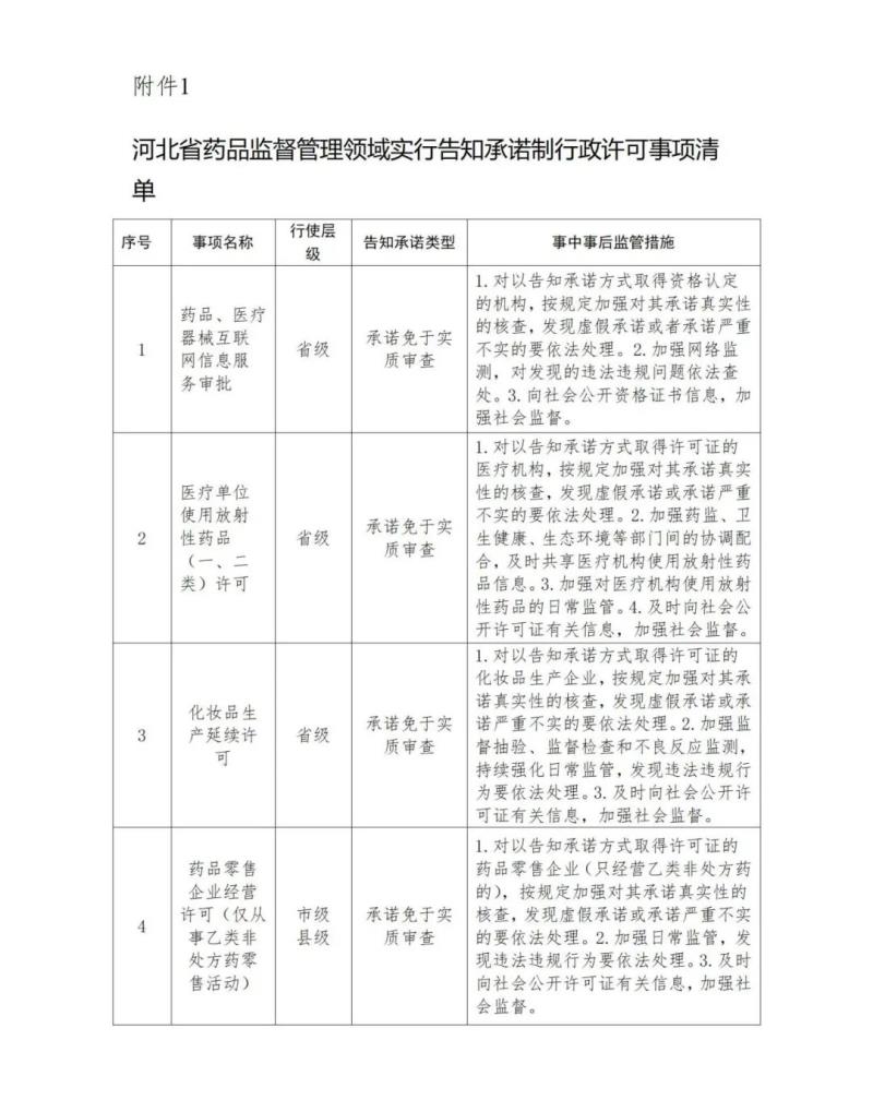 近日,河北省藥監(jiān)局發(fā)布《關(guān)于進(jìn)一步做好行政許可告知承諾制工作的通知》(以下簡(jiǎn)稱《通知》),其中提到,藥品、醫(yī)療器械互聯(lián)網(wǎng)信息服務(wù)審批、醫(yī)療單位使用放射性藥品(一、二類(lèi))許可、化妝品生產(chǎn)延續(xù)許可、藥品零售企業(yè)經(jīng)營(yíng)許可(僅從事乙類(lèi)非處方藥零售活動(dòng))等4項(xiàng)行政許可事項(xiàng)(詳見(jiàn)下方圖片)實(shí)行告知承諾制,相關(guān)監(jiān)管部門(mén)需加強(qiáng)審批和監(jiān)管工作。