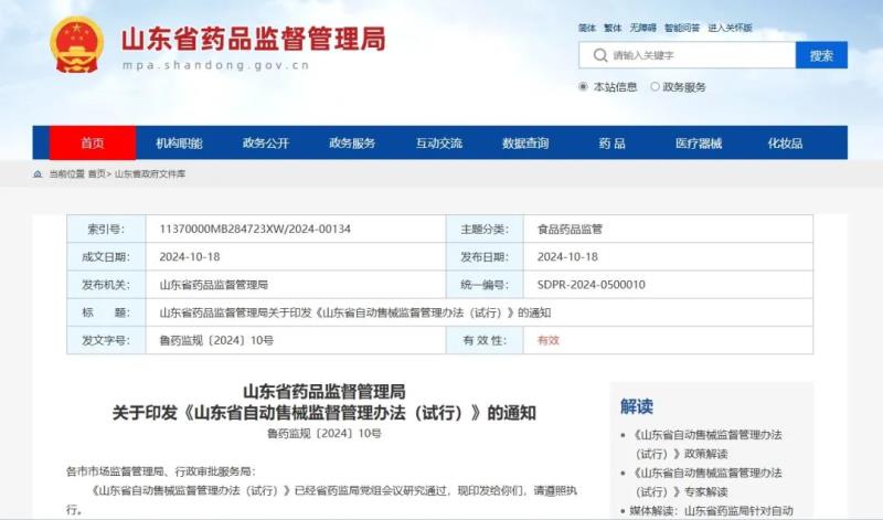 日前,山東省藥監(jiān)局發(fā)布《山東省自動(dòng)售械監(jiān)督管理辦法(試行)》(以下簡稱《辦法》),并宣布自2024年11月18日起施行。