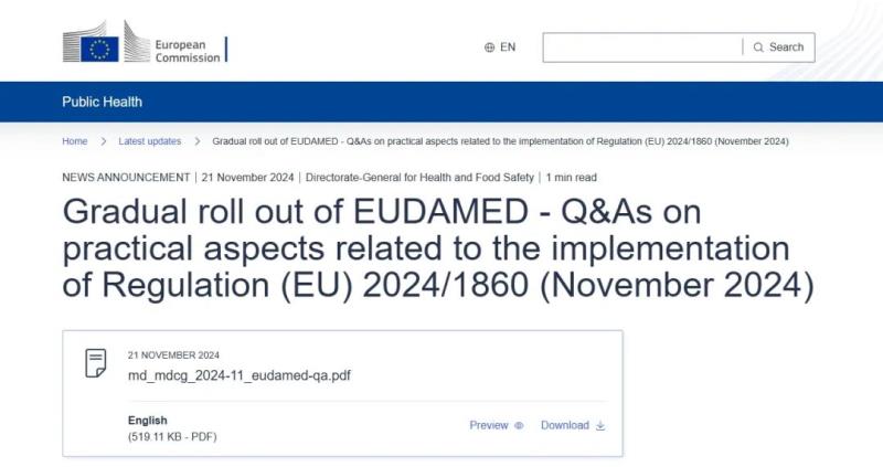 近日,歐盟發(fā)布Gradual roll out of EUDAMED - Q&As on practical aspects related to the implementation of Regulation (EU) 2024/1860,該文件旨在促進歐洲議會和理事會2024年6月13日(EU)2024/1860號法規(guī)的實施,該法規(guī)修訂了(EU)2017/745(MDR)和(EU)2017/746(IVDR)法規(guī),涉及Eudamed的逐步推出、供應中斷時的通知義務以及某些體外診斷醫(yī)療器械的過渡條款。