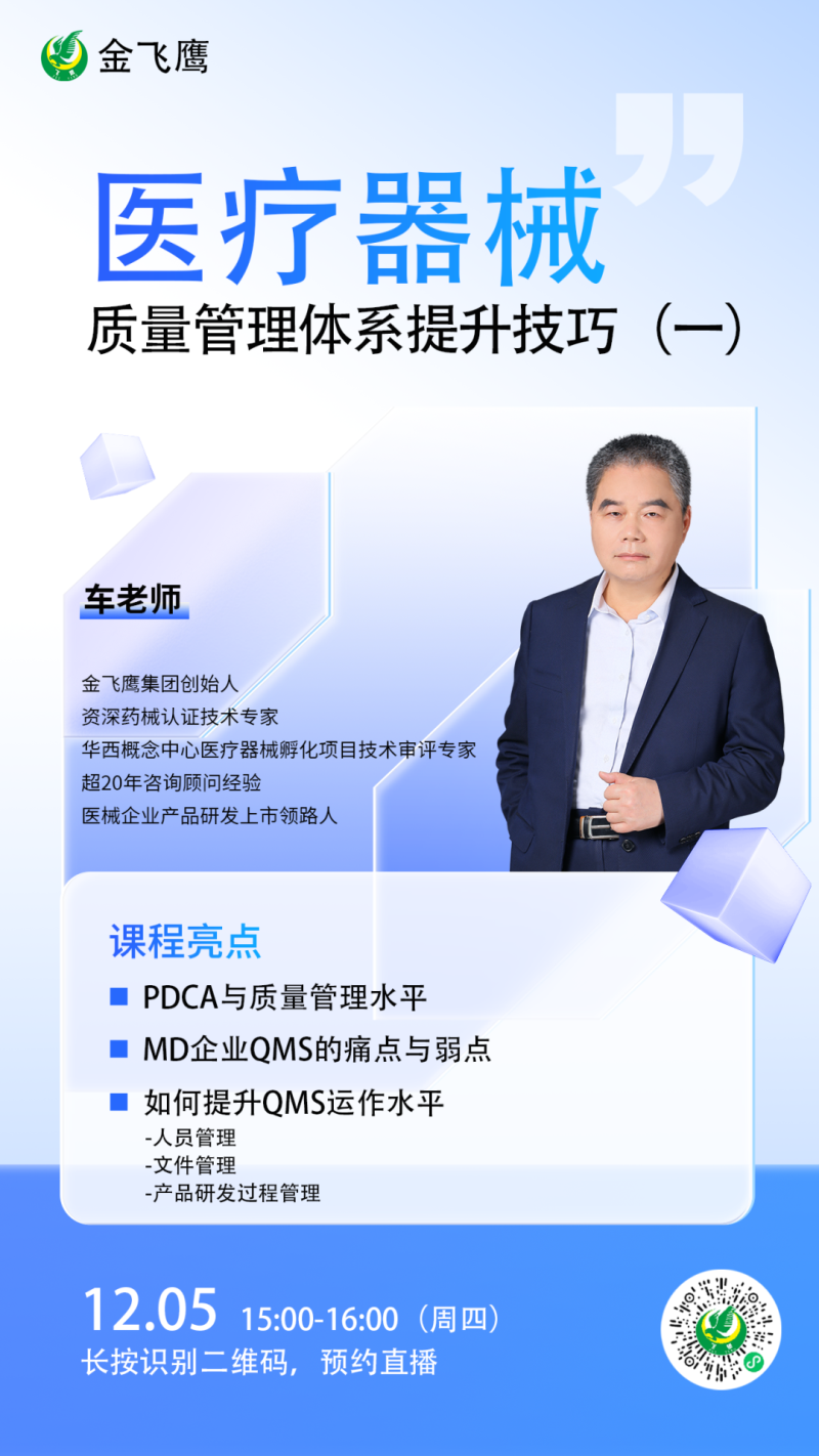 12月5日下午3點(diǎn),金飛鷹集團(tuán)創(chuàng)始人車號(hào)爽老師給大家?guī)?lái)《醫(yī)療器械質(zhì)量管理體系提升技巧(一),培訓(xùn)內(nèi)容包括PDCA與質(zhì)量管理水平、MD企業(yè)QMS的痛點(diǎn)與弱點(diǎn)以及本次課題的重點(diǎn)——如何提升QMS運(yùn)作水平的前半部分,想聽課的朋友記得提前預(yù)約!