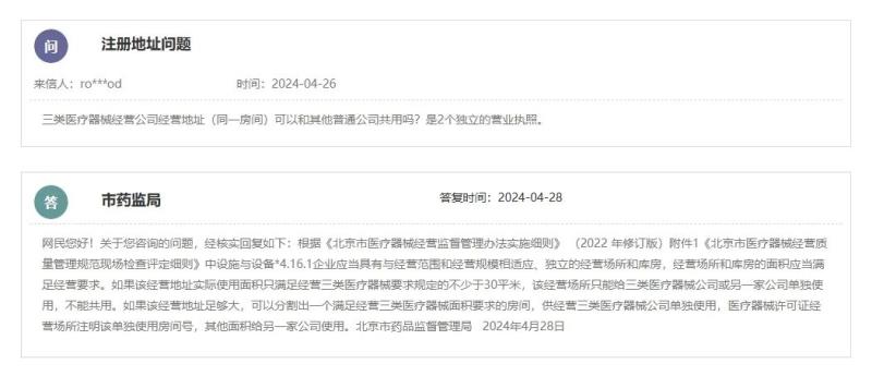 根據(jù)北京市藥監(jiān)局的答復,《北京市醫(yī)療器械經(jīng)營監(jiān)督管理辦法實施細則》(2022 年修訂版)附件1《北京市醫(yī)療器械經(jīng)營質量管理規(guī)范現(xiàn)場檢查評定細則》,其中“設施與設備”章節(jié)4.16.1規(guī)定:“企業(yè)應當具有與經(jīng)營范圍和經(jīng)營規(guī)模相適應、獨立的經(jīng)營場所和庫房,經(jīng)營場所和庫房的面積應當滿足經(jīng)營要求。”