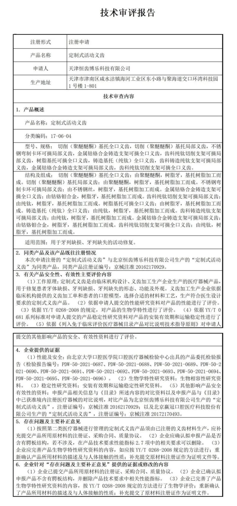 近日,天津市醫(yī)療器械審評(píng)查驗(yàn)中心在其公眾號(hào)“天津器審”公開了天津恒齒博樂科技有限公司定制式活動(dòng)義齒的技術(shù)審評(píng)報(bào)告,其中提到該產(chǎn)品存在問題及主要補(bǔ)正意見如下: