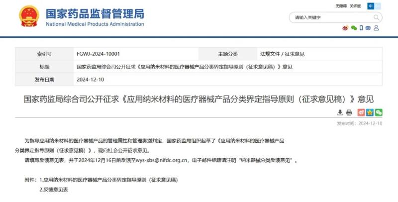 12月10日,國(guó)家藥監(jiān)局發(fā)布《應(yīng)用納米材料的醫(yī)療器械產(chǎn)品分類界定指導(dǎo)原則(征求意見稿)》(以下簡(jiǎn)稱《指導(dǎo)原則》),并向社會(huì)公開征求意見。