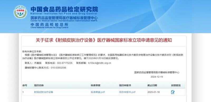 12月19日,國家藥監(jiān)局醫(yī)療器械標(biāo)管中心發(fā)布《射頻皮膚治療設(shè)備》醫(yī)療器械國家標(biāo)準(zhǔn)立項申請意見的通知,同時隨附了標(biāo)準(zhǔn)草案,并向社會公開征求意見。