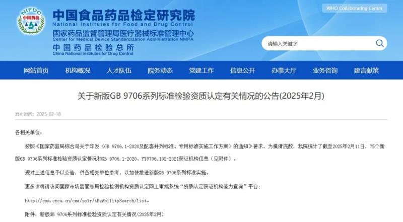 近日,中檢院官網(wǎng)公布了截至2025年2月11日,75個(gè)新版GB 9706系列標(biāo)準(zhǔn)檢驗(yàn)資質(zhì)認(rèn)定情況和GB 9706.1-2020、YY 9706.102-2021獲證機(jī)構(gòu)信息。