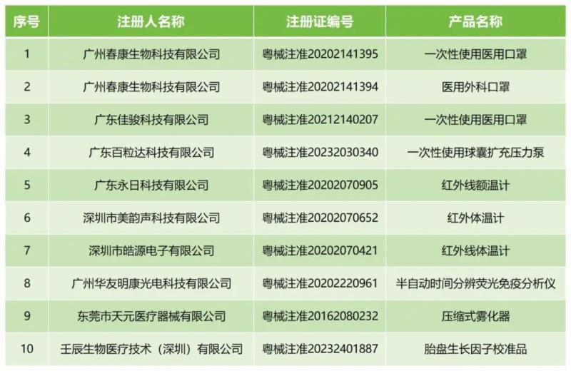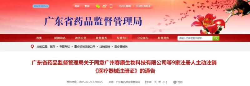 2月25日,廣東藥監(jiān)局發(fā)布通告稱,廣州春康生物科技有限公司、廣東佳駿科技有限公司等9家注冊人向廣東省藥品監(jiān)督管理局主動提出注銷產(chǎn)品注冊證的申請。根據(jù)《醫(yī)療器械監(jiān)督管理條例》的規(guī)定,現(xiàn)對該9家注冊人持有的10張《醫(yī)療器械注冊證》依法予以注銷,主要包括醫(yī)用口罩、紅外體溫計、壓縮式霧化器等產(chǎn)品,具體明細如下: