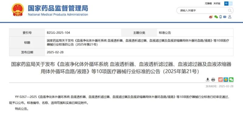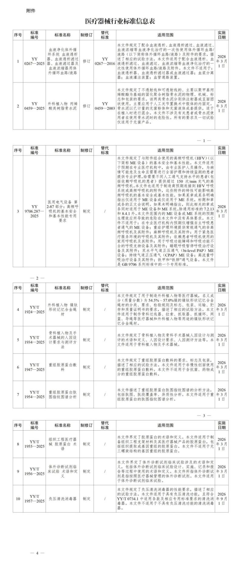 2月28日,國家藥監(jiān)局發(fā)布YY 0267-2025《血液凈化體外循環(huán)系統(tǒng) 血液透析器、血液透析濾過器、血液濾過器及血液濃縮器用體外循環(huán)血路/液路》、YY 9706.287-2025《醫(yī)用電氣設(shè)備 第2-87部分:高頻呼吸機的基本安全和基本性能專用要求》、YY/T 1947-2025《重組膠原蛋白敷料》等10項醫(yī)療器械行業(yè)標準,其中2項標準為修訂,8項為制定,最早自2026年3月1日起實施,具體明細如下: