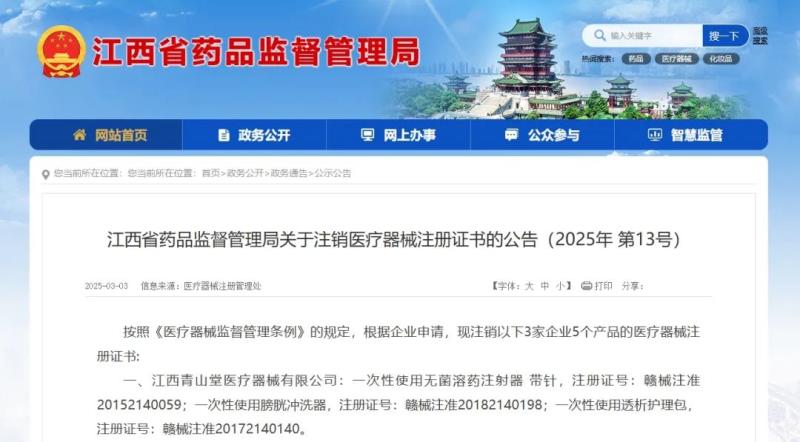 3月3日,江西省藥監(jiān)局發(fā)布通告稱,按照《醫(yī)療器械監(jiān)督管理?xiàng)l例》的規(guī)定,根據(jù)企業(yè)申請(qǐng),該局已注銷江西青山堂醫(yī)療器械有限公司、江西奧格蘭醫(yī)療器械有限公司等3家企業(yè)共計(jì)5個(gè)產(chǎn)品的醫(yī)療器械注冊(cè)證書,具體明細(xì)如下: