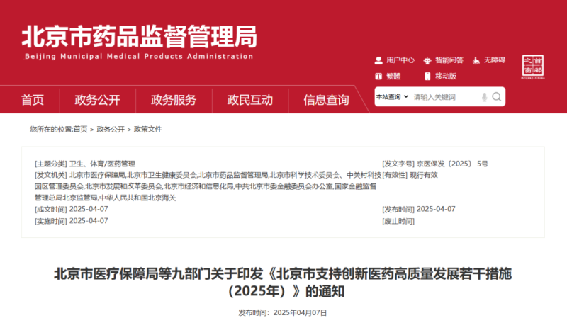 4月7日,北京市醫(yī)療保障局、北京市藥監(jiān)局等九部門(mén)發(fā)布《北京市支持創(chuàng)新醫(yī)藥高質(zhì)量發(fā)展若干措施(2025年)》(以下簡(jiǎn)稱(chēng)《措施》),《措施》共分為八個(gè)部分,包括:持續(xù)促進(jìn)臨床試驗(yàn)提質(zhì)增效(5條)、不斷提升審評(píng)審批效能(6條)、持續(xù)擴(kuò)大創(chuàng)新醫(yī)藥生產(chǎn)流通(6條)、持續(xù)推動(dòng)創(chuàng)新醫(yī)藥臨床使用(5條)、人工智能賦能醫(yī)藥創(chuàng)新發(fā)展(2條)、加強(qiáng)創(chuàng)新醫(yī)藥投融資支持(2條)、優(yōu)化創(chuàng)新醫(yī)藥產(chǎn)業(yè)布局(2條)和保障措施(4條)。