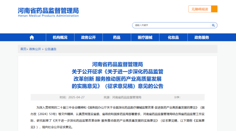 4月27日,河南省藥監(jiān)局發(fā)布《關(guān)于進(jìn)一步深化藥品監(jiān)管改革創(chuàng)新 服務(wù)推動(dòng)醫(yī)藥產(chǎn)業(yè)高質(zhì)量發(fā)展的實(shí)施意見(征求意見稿)》,以下簡(jiǎn)稱《實(shí)施意見》),并向社會(huì)公開征求意見。