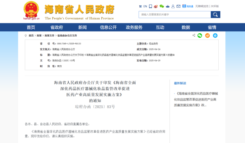 4月29日,海南省人民政府發(fā)布《海南省全面深化藥品醫(yī)療器械化妝品監(jiān)管改革促進醫(yī)藥產(chǎn)業(yè)高質(zhì)量發(fā)展實施方案》(以下簡稱《實施方案》),立足海南自貿(mào)港封關(guān)運作重大戰(zhàn)略機遇,緊扣“強基礎(chǔ)、補短板、破瓶頸、促提升”核心目標(biāo),圍繞“目標(biāo)導(dǎo)向、精準(zhǔn)施策、特色賦能、全鏈協(xié)同”四大維度,通過系統(tǒng)化設(shè)計、精準(zhǔn)化施策,著力打造更具競爭力的產(chǎn)業(yè)發(fā)展生態(tài)。
