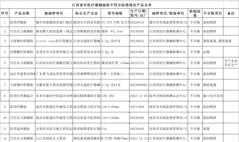 近日,江西省藥監(jiān)局發(fā)布公告稱,該局持續(xù)對本省醫(yī)療器械生產(chǎn)、經(jīng)營和使用環(huán)節(jié)實(shí)施了監(jiān)督抽樣檢驗(yàn),共有12批次產(chǎn)品不符合標(biāo)準(zhǔn)規(guī)定,涉及醫(yī)用冷敷貼、穴位壓力剌激貼、卡波姆婦科凝膠、殼聚糖婦科凝膠等產(chǎn)品,多款產(chǎn)品不合格項(xiàng)目為“添加物質(zhì)”,具體明細(xì)如下: