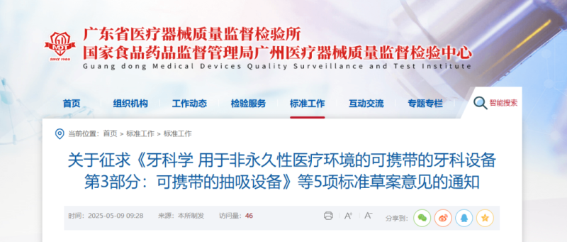 近日,廣東省醫(yī)療器械質(zhì)量監(jiān)督檢驗所發(fā)布通知稱,根據(jù)《國家藥監(jiān)局綜合司關(guān)于印發(fā)2025年醫(yī)療器械行業(yè)標(biāo)準(zhǔn)制修訂計劃項目的通知》的要求,以及全國口腔材料和器械設(shè)備標(biāo)準(zhǔn)化技術(shù)委員會齒科設(shè)備與器械分技術(shù)委員會2025年的標(biāo)準(zhǔn)制修訂工作安排,齒科分技委組織相關(guān)起草單位完成了《牙科學(xué) 用于非永久性醫(yī)療環(huán)境的可攜帶的牙科設(shè)備 第3部分:可攜帶的抽吸設(shè)備》《牙科學(xué) 根管器械 第2部分:擴大鉆》等5項標(biāo)準(zhǔn)草案征求意見稿,具體如下: