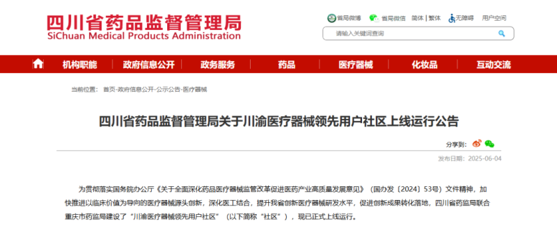該社區(qū)平臺的開發(fā)上線是落實國務(wù)院辦公廳《關(guān)于全面深化藥品醫(yī)療器械監(jiān)管改革促進(jìn)醫(yī)藥產(chǎn)業(yè)高質(zhì)量發(fā)展意見》(國辦發(fā)〔2024〕53號)文件精神的重要舉措。四川省藥監(jiān)局相關(guān)負(fù)責(zé)人表示,今后將持續(xù)拓展優(yōu)化社區(qū)平臺功能,逐步擴(kuò)大行業(yè)用戶覆蓋面,進(jìn)一步整合省內(nèi)臨床和醫(yī)療器械研發(fā)資源,為醫(yī)療器械創(chuàng)新研發(fā)提供全方位、全過程的服務(wù)支撐,助力臨床研究成果轉(zhuǎn)化,營造良好醫(yī)療器械創(chuàng)新生態(tài)。