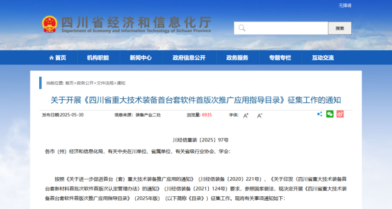 近日,四川省經(jīng)濟(jì)和信息化廳發(fā)布《關(guān)于開展〈四川省重大技術(shù)裝備首臺套軟件首版次推廣應(yīng)用指導(dǎo)目錄〉征集工作的通知》(以下簡稱《通知》),其中提到,申請列入《四川省重大技術(shù)裝備首臺套軟件首版次推廣應(yīng)用指導(dǎo)目錄(2025版)》的重大技術(shù)裝備產(chǎn)品應(yīng)能夠支撐打造現(xiàn)代產(chǎn)業(yè)體系、建設(shè)國家戰(zhàn)略腹地,重點(diǎn)聚焦人工智能、低空經(jīng)濟(jì)、航空航天、新能源、高端能源裝備、新能源汽車及動力電池等重點(diǎn)產(chǎn)業(yè)鏈領(lǐng)域,工業(yè)母機(jī)、軌道交通裝備等領(lǐng)先領(lǐng)域,行業(yè)專用裝備等優(yōu)勢領(lǐng)域,先進(jìn)核技術(shù)應(yīng)用裝備、未來交通裝備、深空深地裝備等新興和未來領(lǐng)域,以及重大工程施工裝備、農(nóng)機(jī)裝備、應(yīng)急裝備、醫(yī)療裝備、民生裝備等領(lǐng)域。