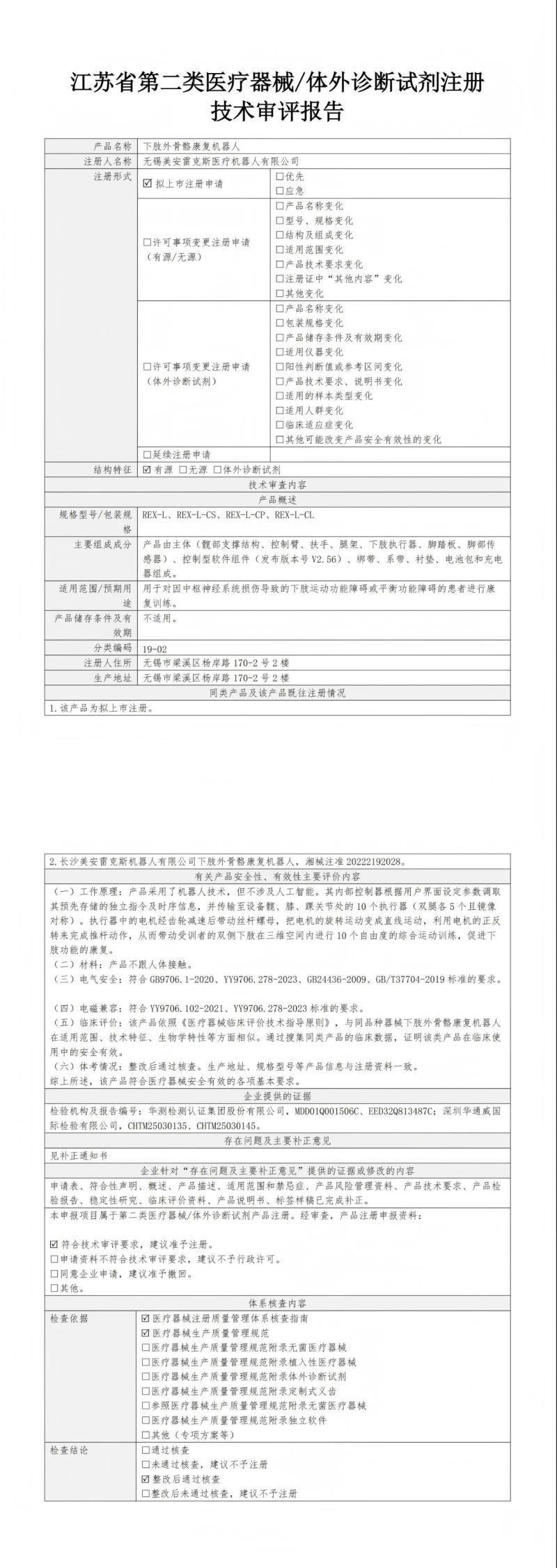 近日,江蘇省藥監(jiān)局公布了2025年5月批準注冊的磁刺激治療儀、重組膠原蛋白液體敷料、生命體征檢測儀、一次性使用無菌皮膚滾針、短波治療儀、艾灸儀、醫(yī)用透明質(zhì)酸鈉凝膠敷料、下肢外骨骼康復(fù)機器人等164個醫(yī)療器械產(chǎn)品目錄,同時隨附了所有產(chǎn)品的技術(shù)審評報告,我們其中“下肢外骨骼康復(fù)機器人”(預(yù)期用途:用于對因中樞神經(jīng)系統(tǒng)損傷導(dǎo)致的下肢運動功能障礙或平衡功能障礙的患者進行康復(fù)訓(xùn)練)的技術(shù)審評報告以圖片形式轉(zhuǎn)載如下: