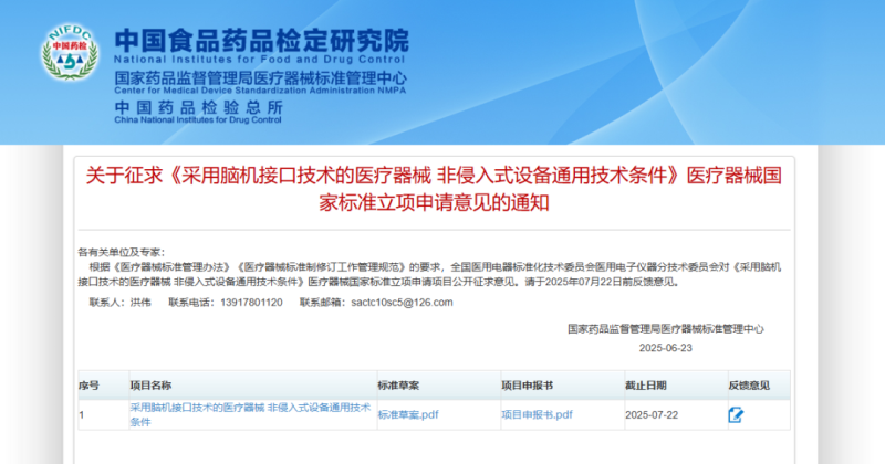 6月23日,國家藥監(jiān)局醫(yī)療器械標管中心發(fā)布《采用腦機接口技術的醫(yī)療器械 非侵入式設備通用技術條件》醫(yī)療器械國家標準立項申請,同時隨附了標準草案,并向社會公開征求意見。