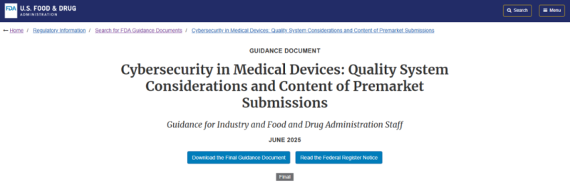 6月27日,F(xiàn)DA發(fā)布有關(guān)醫(yī)療器械網(wǎng)絡(luò)安全的指南文件Cybersecurity in Medical Devices:Quality System Considerations and Content of Premarket Submissions,用以取代 2023 年 9 月 27 日發(fā)布的最終指南“醫(yī)療器械中的網(wǎng)絡(luò)安全:質(zhì)量體系注意事項(xiàng)和上市前提交的內(nèi)容”。該指南首次將網(wǎng)絡(luò)安全要求從“推薦性指南”升級(jí)為“法定強(qiáng)制”,全面強(qiáng)化醫(yī)療器械全生命周期的網(wǎng)絡(luò)安全監(jiān)管。