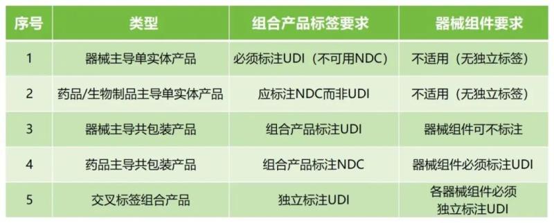 該草案提到,如21 CFR第3部分所述,組合產(chǎn)品由兩種或兩種以上不同類型的產(chǎn)品組成(即藥物、器械和/或生物制品的組合)。在組合產(chǎn)品中所包含的每種藥物、器械和生物制品都被稱為該組合產(chǎn)品的組成部分。一般包括單一實體組合產(chǎn)品、共包裝組合產(chǎn)品及交叉標簽組合產(chǎn)品等,相應(yīng)的UDI要求如下: