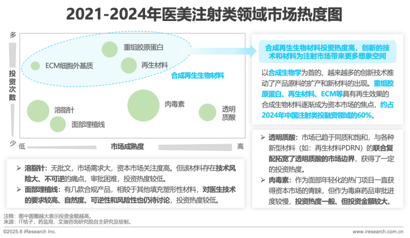技術(shù)的進(jìn)步推動著上游原料的擴(kuò)產(chǎn)和材料的多樣化、安全化和同源化,ECM等各種新型材料不斷出現(xiàn),以重組膠原蛋白、再生材料等為首的合成再生生物材料成為醫(yī)美機(jī)構(gòu)投資重點(diǎn)。根據(jù)IT桔子數(shù)據(jù),2024年包括泰美瑞、圣至潤和等在內(nèi)的再生生物材料領(lǐng)域的企業(yè)紛紛融資,投資事件約占總注射類材料投資的60%。按照審批情況來看,根據(jù)藥監(jiān)局不完全統(tǒng)計,截止到2024年11月一共有15款針劑通過審批,以玻尿酸類為主,還有幾款聚左旋乳酸、聚己內(nèi)酯和肉毒素類產(chǎn)品。雖然玻尿酸領(lǐng)域近年來投資熱度一般,但其仍為注射類市場的“老字號產(chǎn)品”和“熱門賽道”,與各種新型材料的聯(lián)合復(fù)配也將進(jìn)一步豐富產(chǎn)品矩陣,拓寬注射類市場邊界。