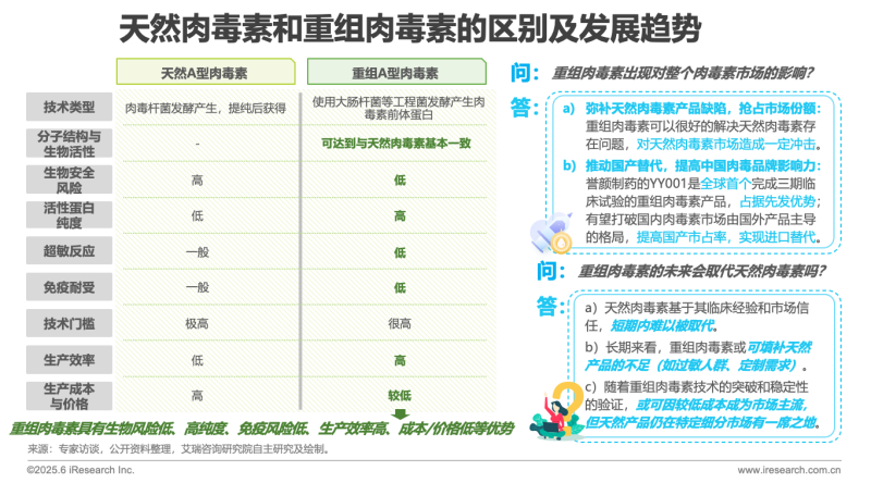 天然肉毒素是從肉毒桿菌培養(yǎng)液中提取的神經(jīng)毒素,含有毒素蛋白及輔助蛋白,臨床應(yīng)用歷史悠久,但可能存在批次差異和雜質(zhì)風(fēng)險。重組肉毒素通過基因工程生產(chǎn),僅含純化毒素蛋白,純度高、穩(wěn)定性強(qiáng),并可定制化調(diào)整效力或持久性。未來,重組肉毒素有望憑借安全性和可設(shè)計性逐步滲透醫(yī)美市場,但短期內(nèi)天然產(chǎn)品仍占主導(dǎo)。長期來看,兩者可能共存——重組產(chǎn)品側(cè)重高純度、個性化需求,而天然產(chǎn)品依賴品牌信任和成熟應(yīng)用。技術(shù)進(jìn)步和成本優(yōu)化將是重組肉毒素能否顛覆市場的關(guān)鍵。
