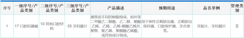 我們通過(guò)查看本次獲證產(chǎn)品的“結(jié)構(gòu)及組成”可以看到,此類產(chǎn)品“由具有醫(yī)療器械注冊(cè)證的牙科膜片經(jīng)壓制成型后打磨、拋光而成?!币虼?,牙膠片/牙科膜片是正畸矯治器最為關(guān)鍵的一項(xiàng)原材料,可以外購(gòu),也可以企業(yè)自己生產(chǎn),但前提是要有注冊(cè)證(同樣是Ⅱ類產(chǎn)品,分類編碼17-10-05)。