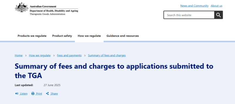近日,澳大利亞TGA更新了2025年7月起(新的財年)的費用和收費摘要,涉及Therapeutic Goods Act 1989范圍內所有活動的費用,我們對其中大家最為關注的醫(yī)療器械(包括體外診斷試劑)收費部分進行重點轉載: