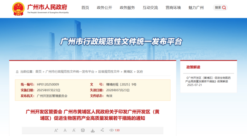 本政策措施自印發(fā)之日起施行,有效期3年。本政策措施所執(zhí)行的市級政策文件,其時效從其規(guī)定;執(zhí)行期間因上級法律法規(guī)、規(guī)章及政策調(diào)整導(dǎo)致本政策措施與上級規(guī)定不一致的,本政策措施相應(yīng)條款不再執(zhí)行?!稄V州開發(fā)區(qū)(黃埔區(qū))促進(jìn)生物醫(yī)藥產(chǎn)業(yè)高質(zhì)量發(fā)展辦法》(穗埔府規(guī)〔2024〕4號)同時廢止。