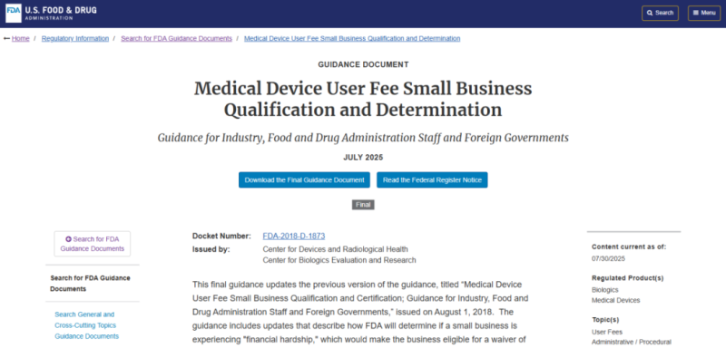 近日,FDA更新了有關小企業(yè)資質申請的指南文件Medical Device User Fee Small Business Qualification and Determination,在指南中詳細說明了“小企業(yè)注冊年費減免”的條件。