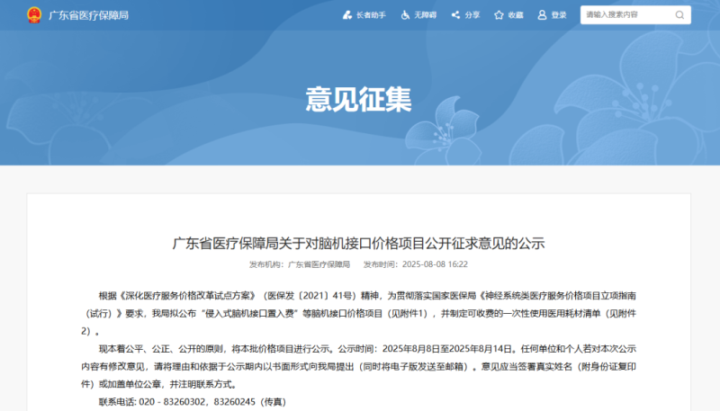 近日,廣東省醫(yī)療保障局公布“侵入式腦機接口置入費”等腦機接口價格項目,同時制定可收費的一次性使用醫(yī)用耗材清單,并將價格項目進行公示。公示時間:2025年8月8日至2025年8月14日。