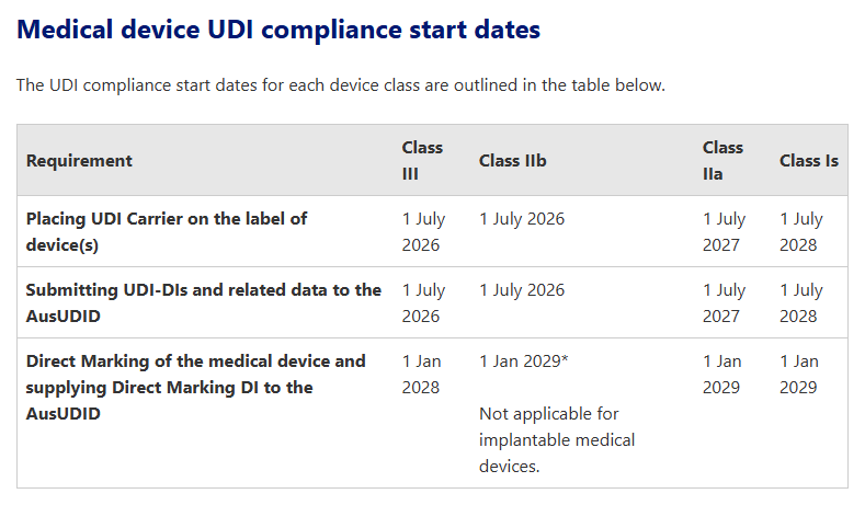 這其中,最早實(shí)施UDI的為Ⅲ類及Ⅱb類醫(yī)療器械,需要在2026年7月1日起將UDI載體放在設(shè)備標(biāo)簽上及向AusUDID 提交 UDI-DI 和相關(guān)數(shù)據(jù),最晚的則是1類和2類IVD,需要在2030年1月1日完成有關(guān)UDI的所有操作。